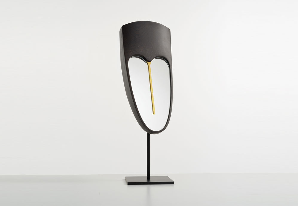 The semiotics of the mask that hides joined to the reflection of the mirror, is in itself explosive. Lorenza Bozzoli, surprise us once again with her very contemporary educated crossbreeding references and offers us a totemic object. Structure in solid wood stained ash, mirror and brass details, may be hanged on a wall or leaned on iron stand.